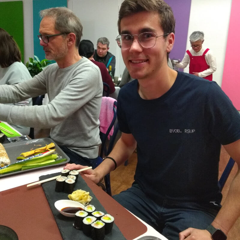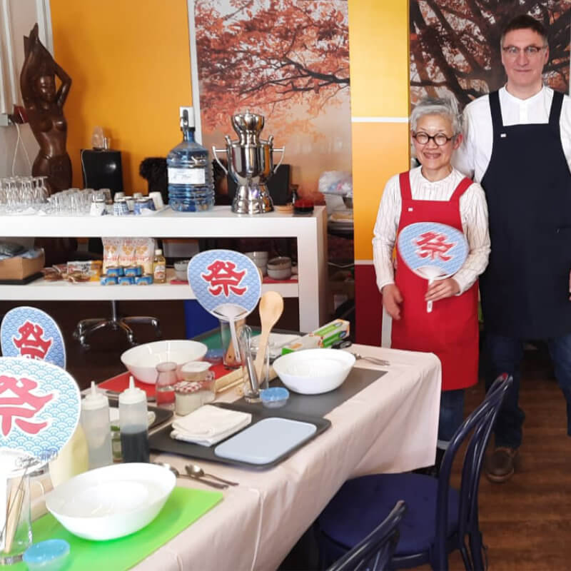 Sushi [japanisch 寿司–„saurer Reis“], Japans beliebte Delikatesse, selber zuhause zubereiten: in diesem Workshop lernen wir, leckeres Sushi in mehreren Varianten eigenhändig herzustellen, auch ohne fangfrischen rohen Seefisch, dafür mit regional verfügbaren Zutaten. Unter Anleitung der Japanerin Yoshie Ichimonji – genannt „Itschi“ – werden wir die kleinen Leckereien nach japanischer Hausfrauenart zusammenstellen und in Form bringen und eine Auswahl davon im Anschluß gemeinsam verspeisen. Dazu servieren wir Misosuppe und nach Wunsch grünen Tee, Pflaumenwein, japanisches Bier, Sake oder fränkischen Weißwein. Sie bringen nur gute Laune und ein scharfes Messer mit, alle anderen Arbeitsmittel und die Zutaten werden gestellt. Alle Getränke und Zutaten sind im Preis inbegriffen.